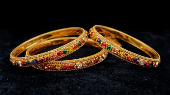 Gold-toned, stone-studded, and traditional bangles.